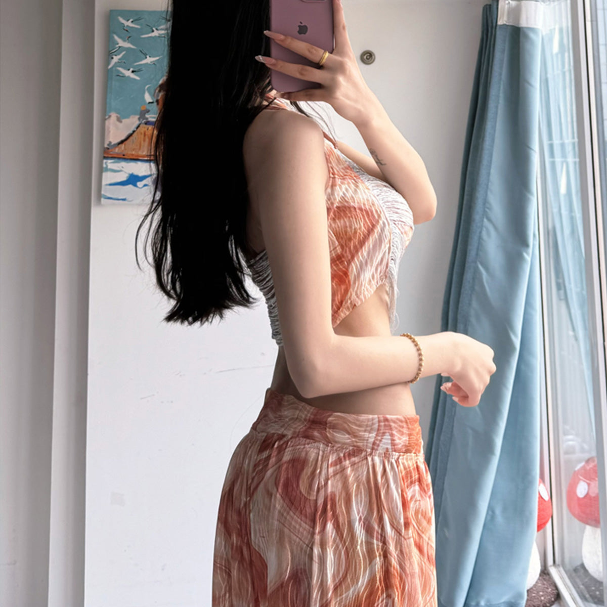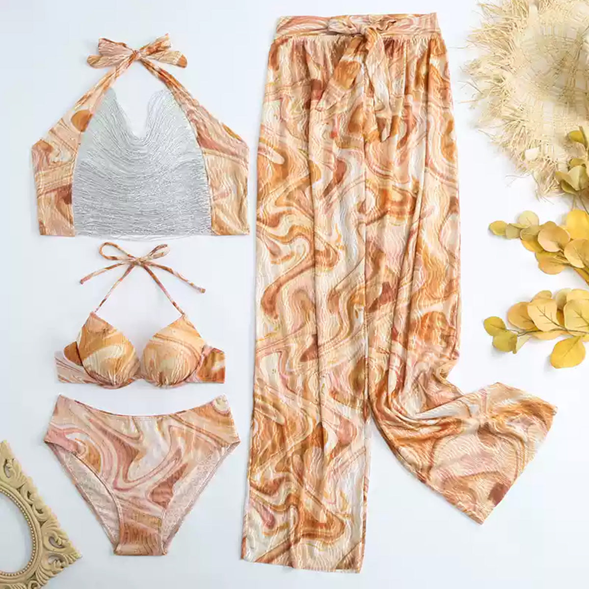 Floral suspender summer vacation style hot girl dress vacation four-piece set printed swimsuit