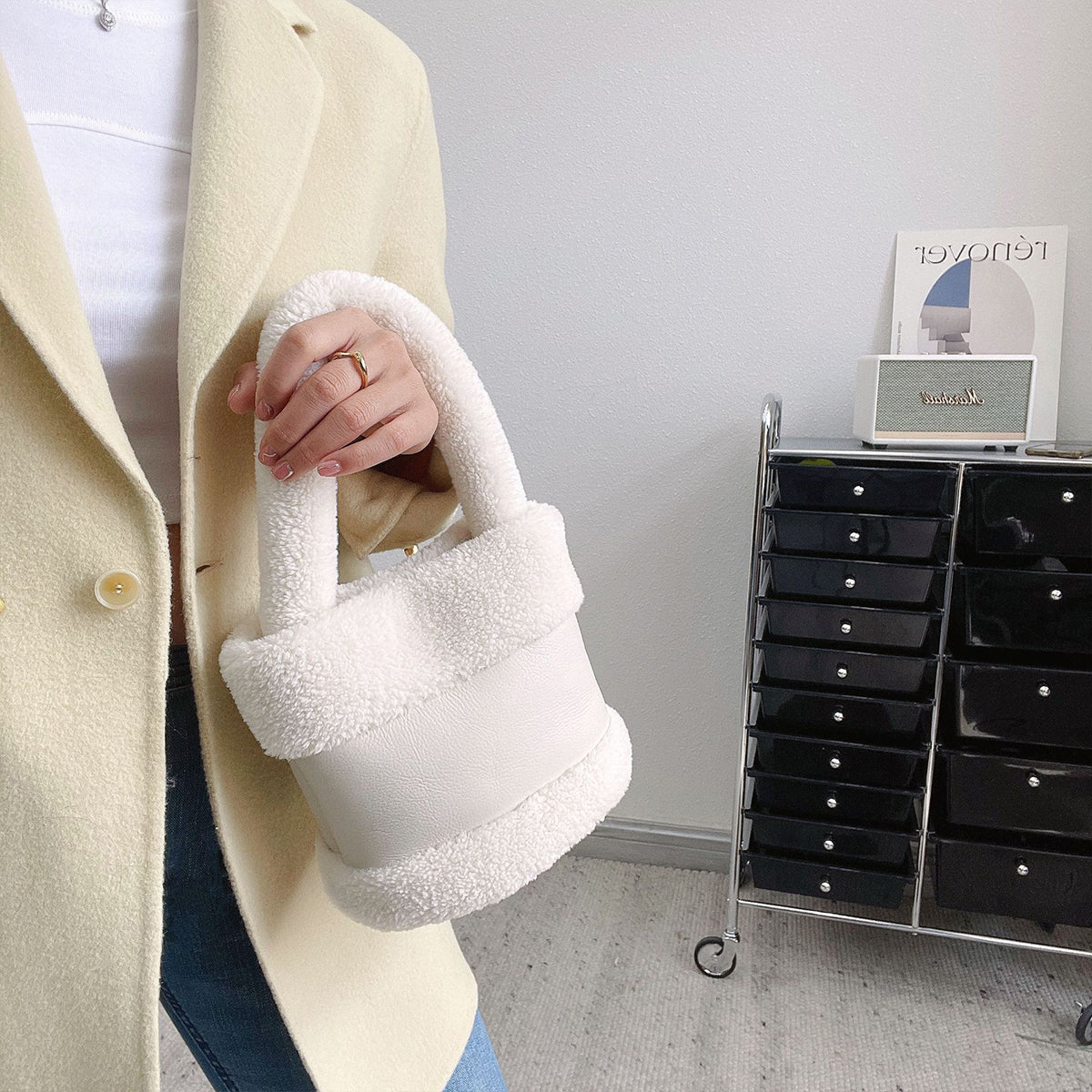 New style basket furry women's bag, leather and fur integrated autumn and winter bucket bag, fashionable retro plush bag handbag
