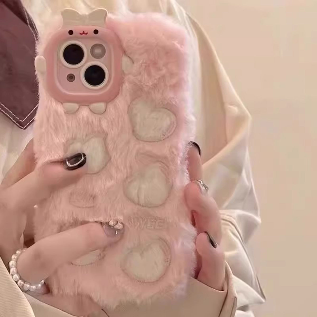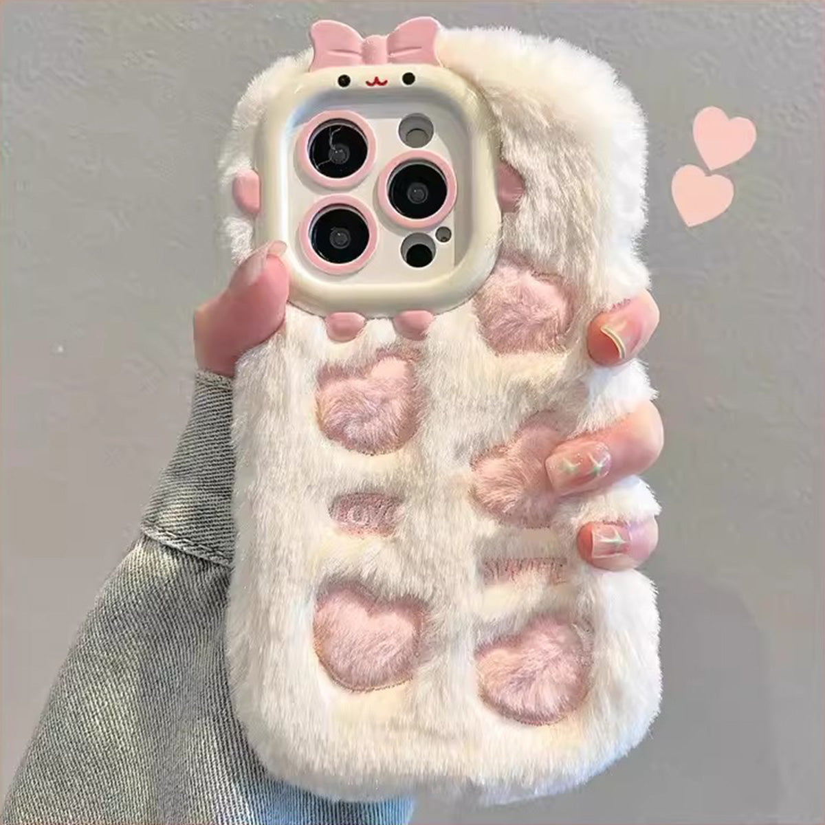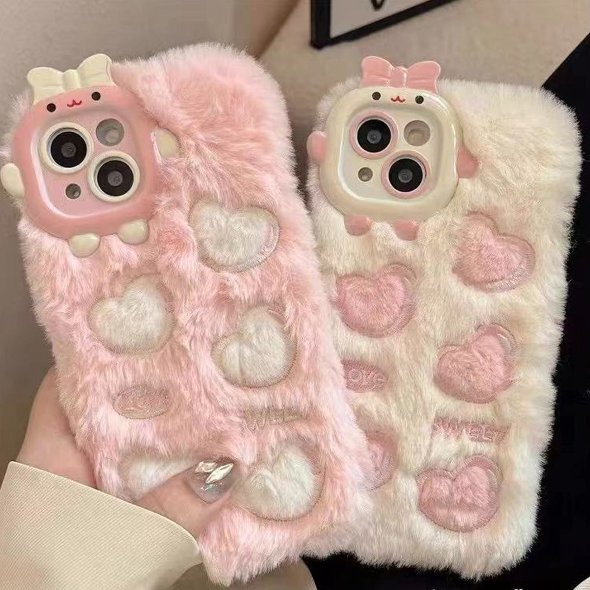 Plush embroidered heart for iPhone 16 mobile phone case, cute bow iPhone 15 autumn and winter anti-fall protective cover