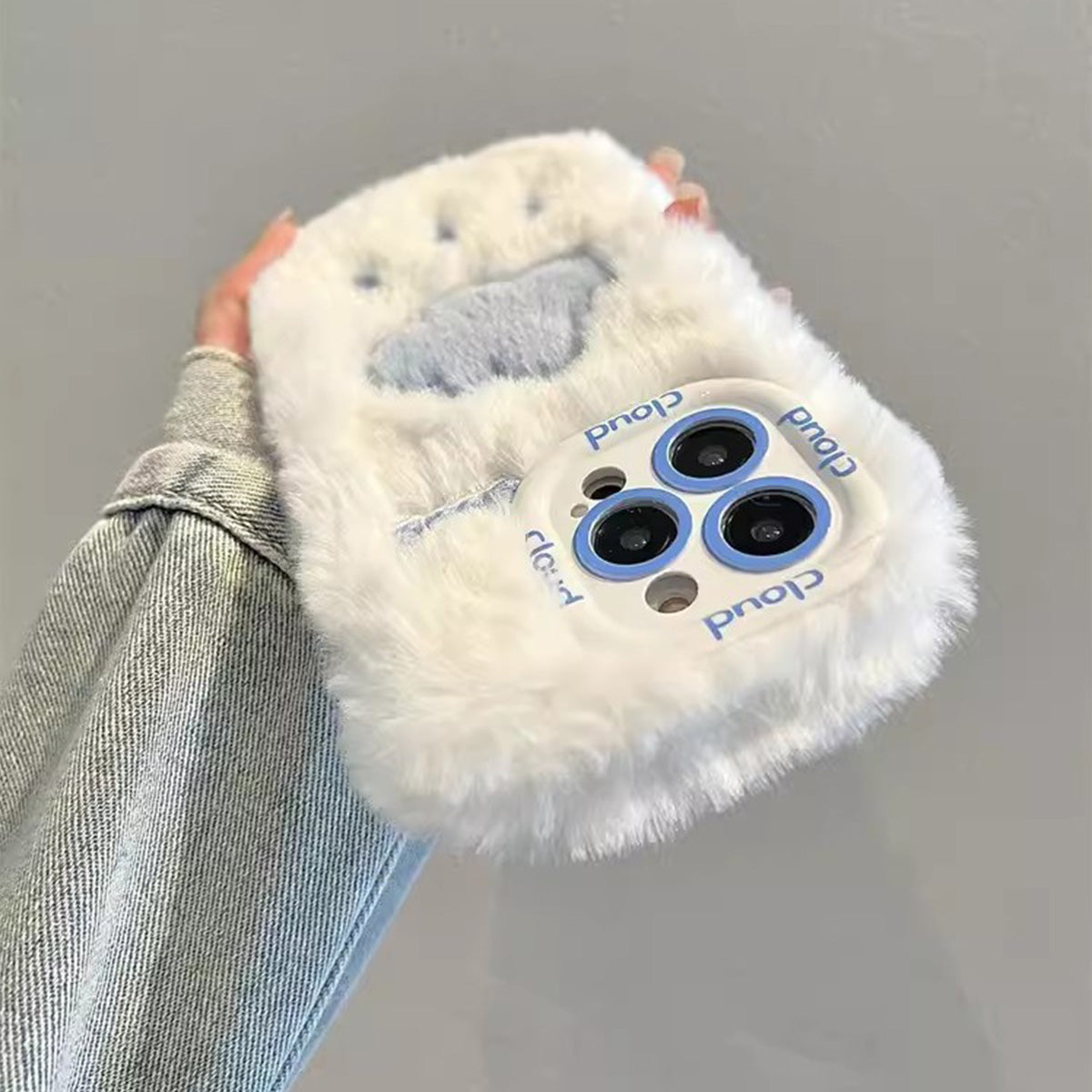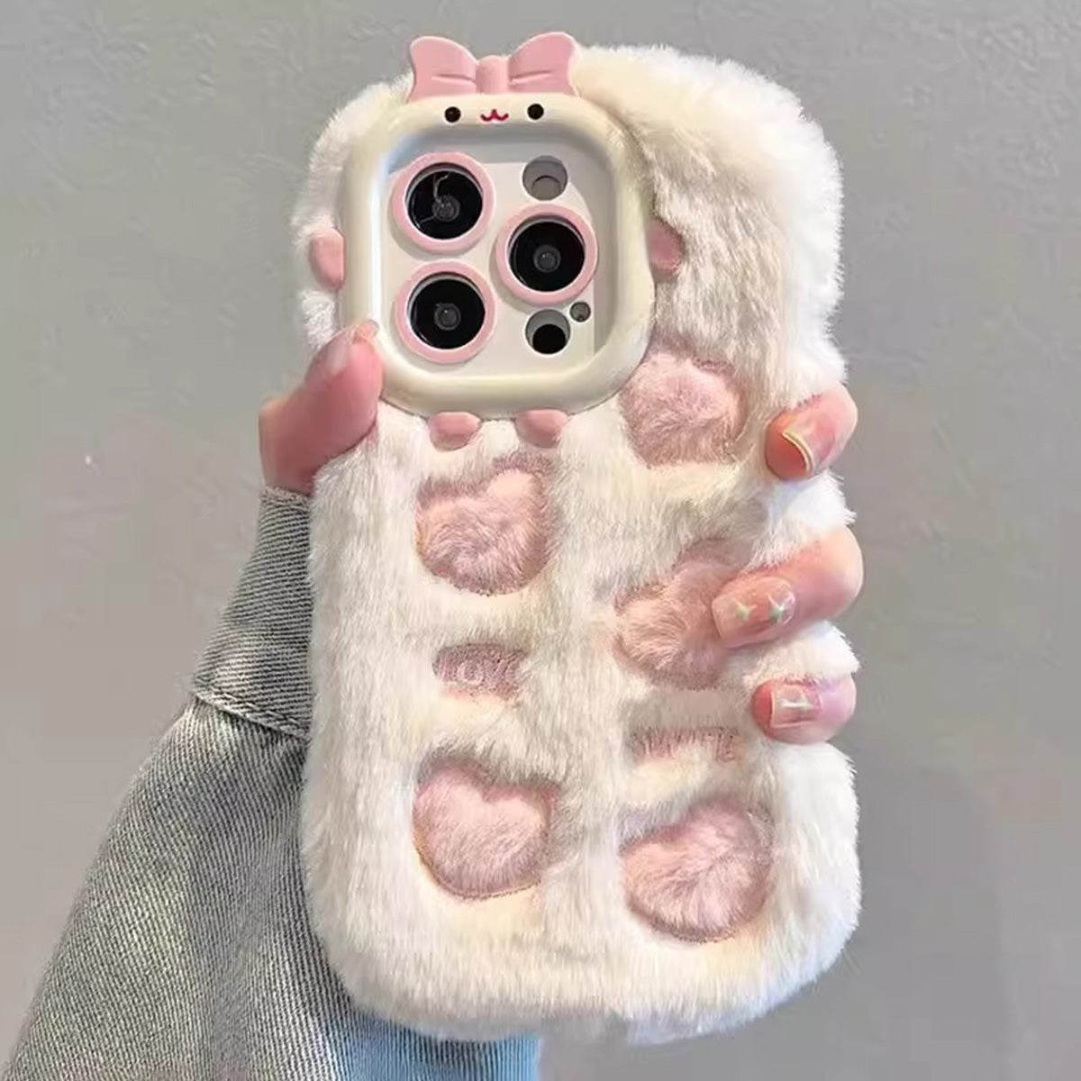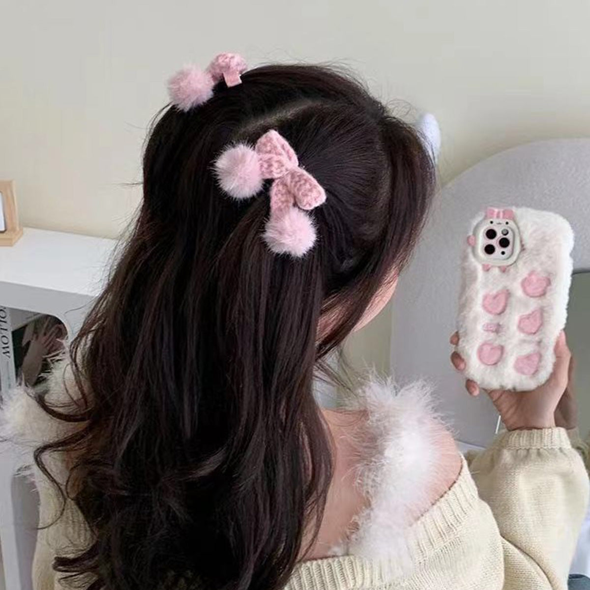 Plush embroidered heart for iPhone 16 mobile phone case, cute bow iPhone 15 autumn and winter anti-fall protective cover