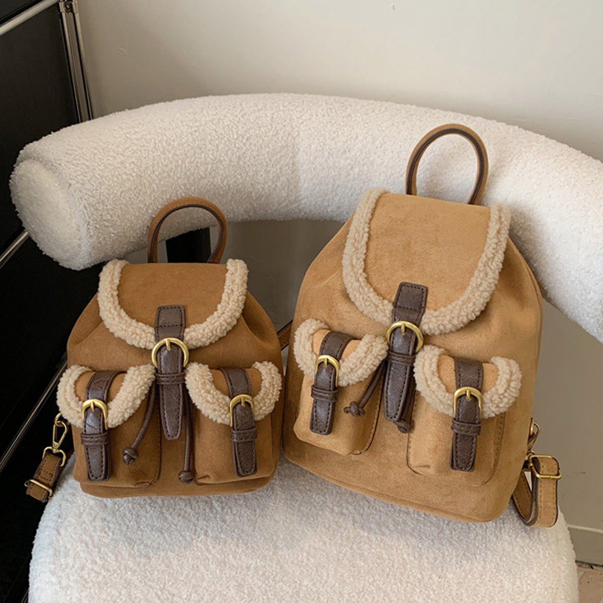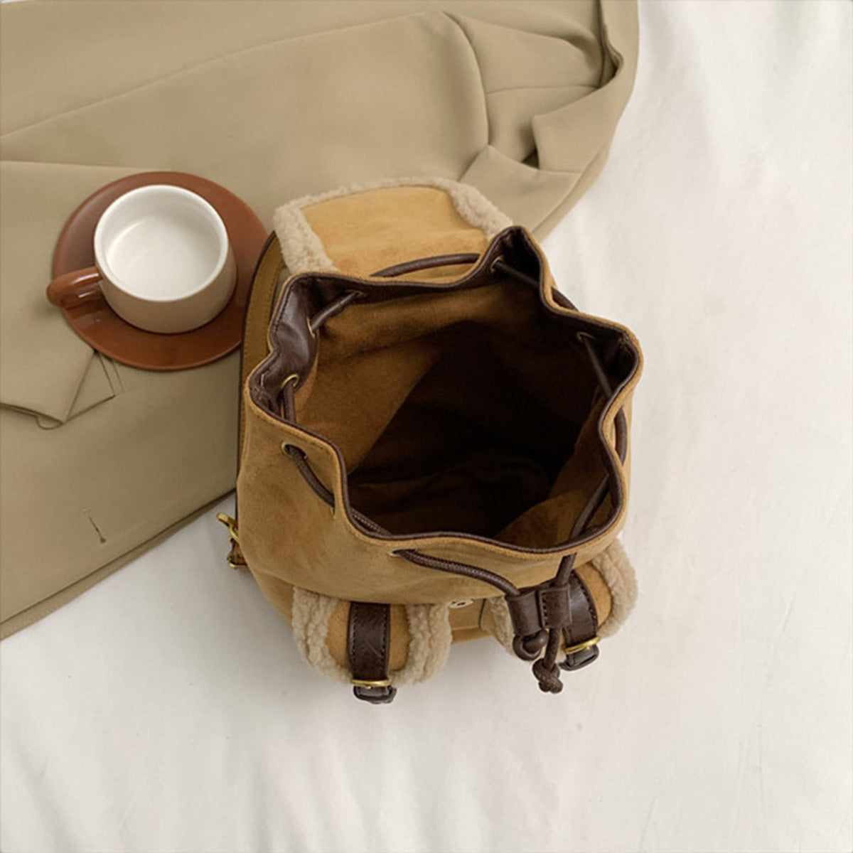 Autumn and winter retro suede drawstring backpack for women, new Korean lamb wool patchwork, high-end small handbag
